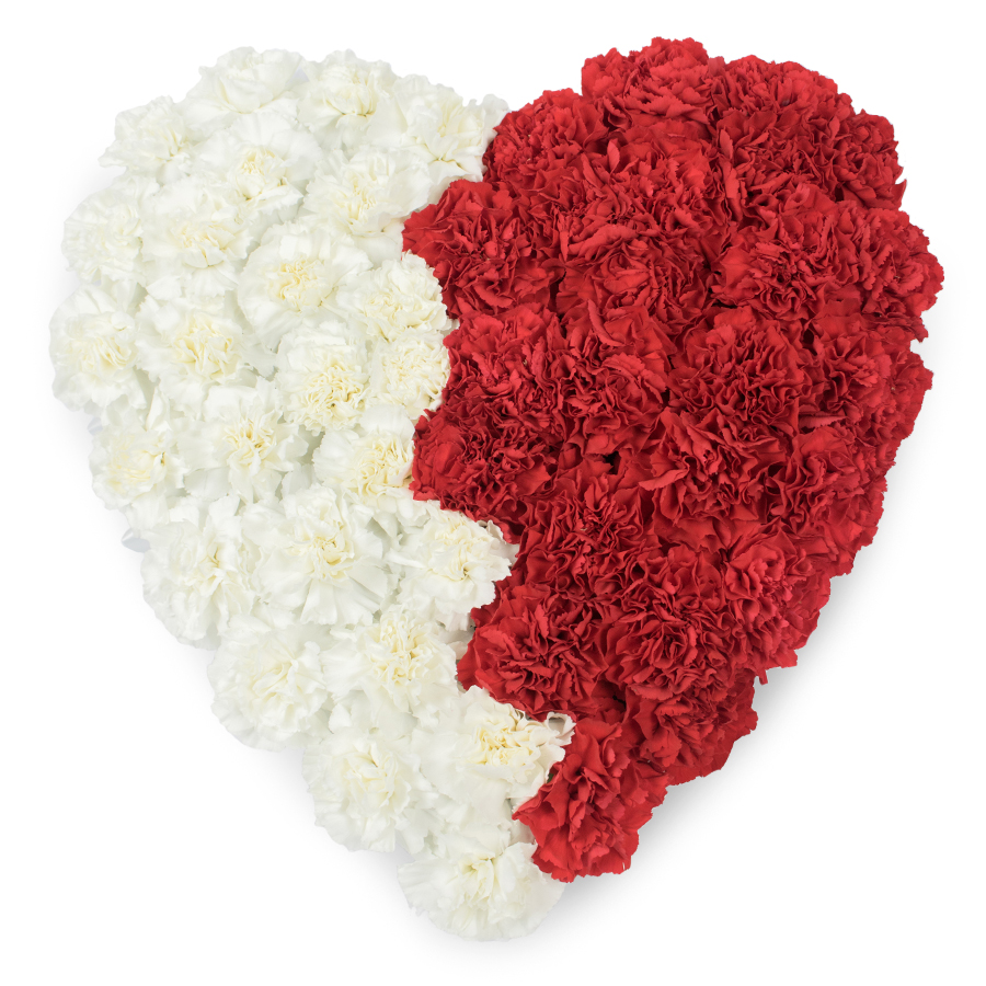 Our stunning heart-shaped mixed carnations by Handy Flowers combines white and red carnations to create a visually captivating and emotionally rich bouquet. Perfect for expressing sympathy, love, or appreciation.